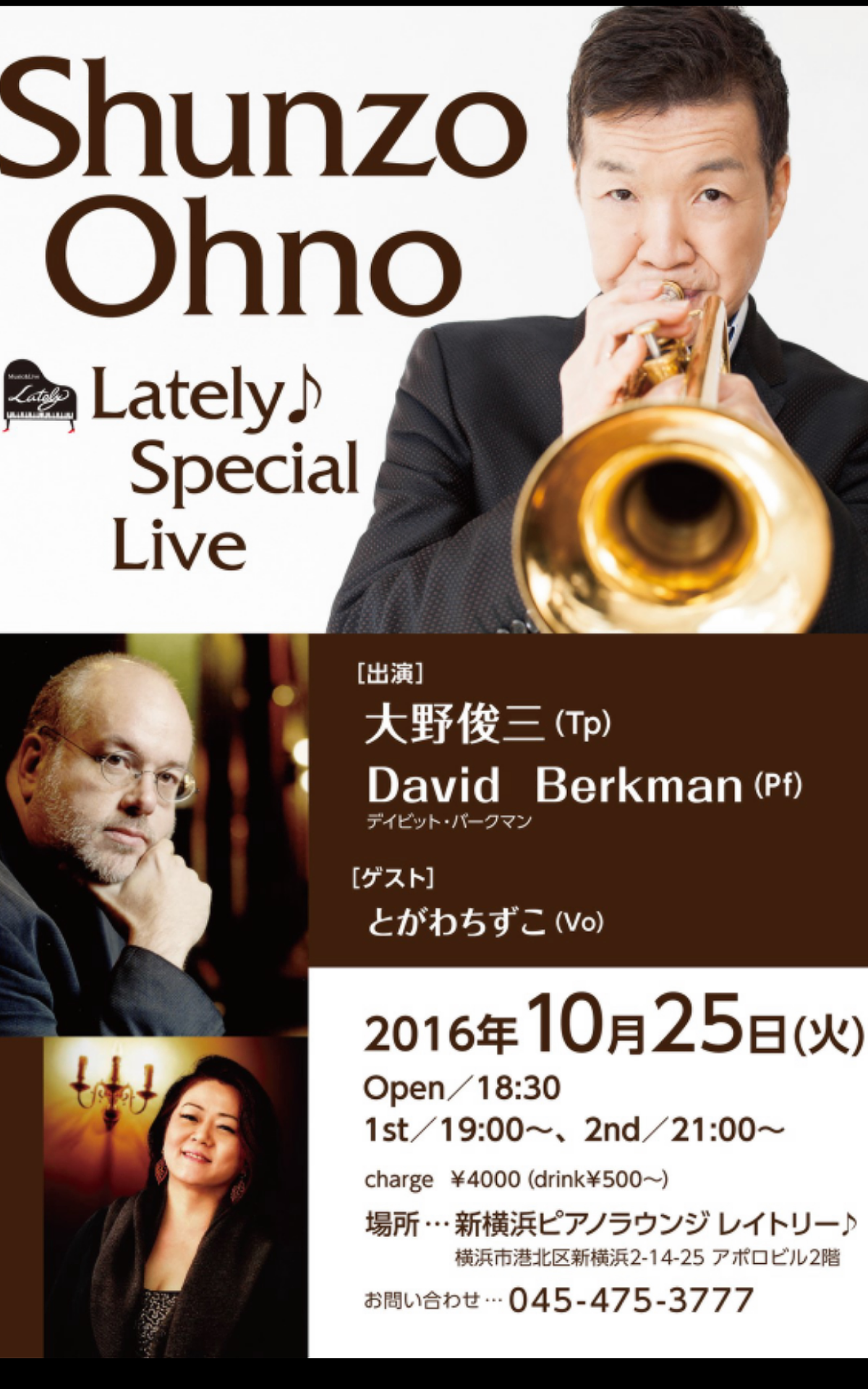おまちかねのライブ情報です。ニューヨークから、今年も、大野俊三さん来日です。